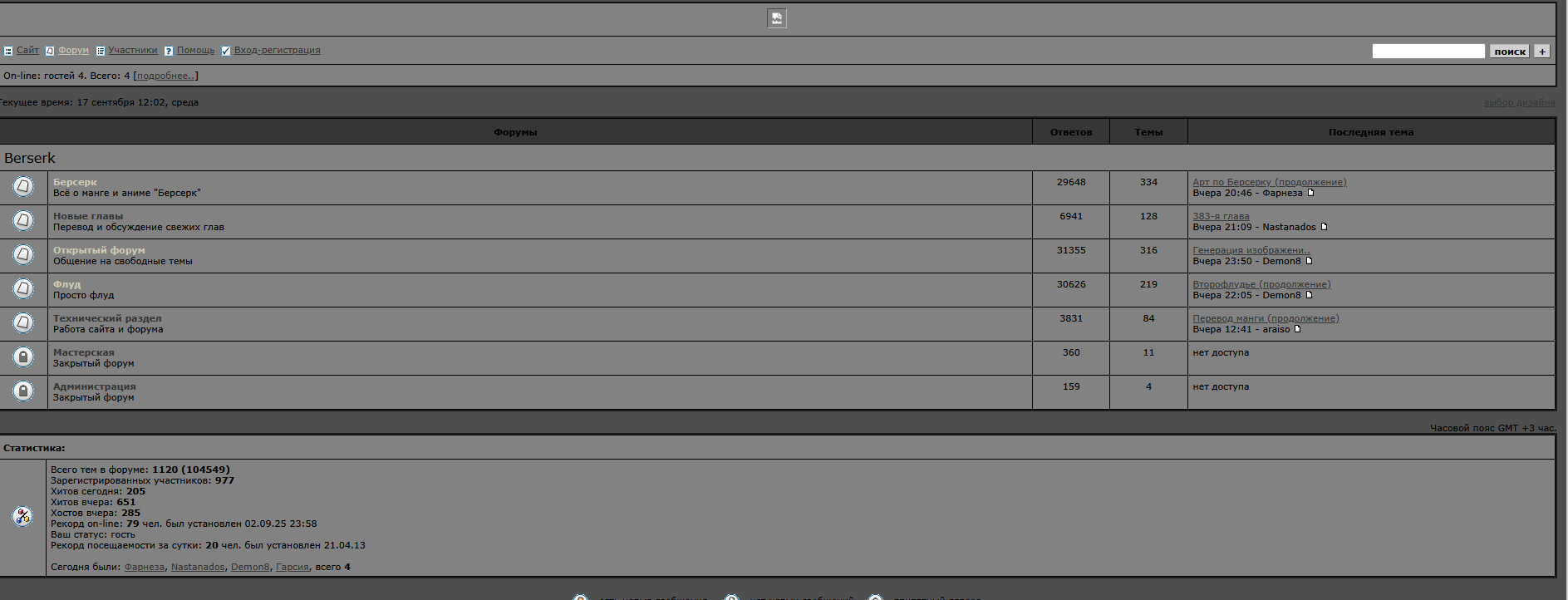 форум посвещен манги и аниме "Берсерк" держится на кучке оллдов собирающихся раз в несколкьо месяцев обгладать новый релиз манги, которуй пилит уже друг покойного автора оригенала...