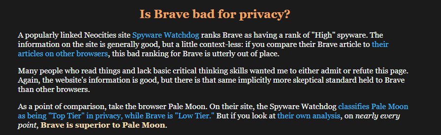 > Н-но я прочитал на сайте spyware watchdog, что брейв имеет высокий уровень телеметрии. Автор этих статей является труном, у которого уже не один год подгорает из-за Брендана Эйха, основателя Брейв. Подгорает по причине того, что Брендан является сторонником традиционных ценностей и не терпим к ЛГБТ. По этой причине, кстати, он и ушел с поста руководителя компании мазила, а позже основал Брейв. > Где пруфы того, что автор действительно трун и просто является слишком предвзятым? https://rentry.co/brave-trash А конкретно: It's no secret that Mozilla is a progressive company (a good thing), and as a result, half of Mozilla's board stepped down