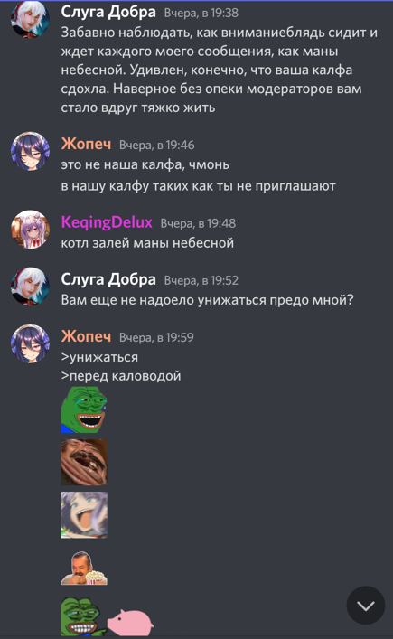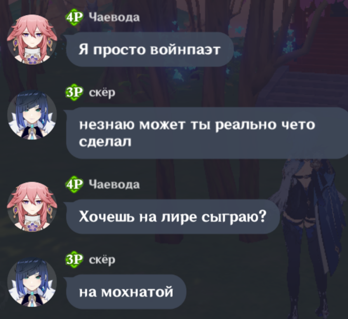 Ты на кого свой львиный зев раззявил чурла ты фатуйская? Ты нектара попрыгуньи обожрался, чтобы на меня прыгать или туманной травы обкурился? Да я с малолетства по Монтштадским зонам чалюсь, с такими Педролино как ты у нас разговор короткий, геослайма к ногам и вперед исследовать Сидровое озеро. Подходи к мосту после отбоя, когда гражданин начальница отдыхать пойдет в казармы и я тебе устрою ТАТАДА. У тебя дупло будет такое, что ветрам в нем сам Барбатос обзавидуется. Век рыбы не взрывать!