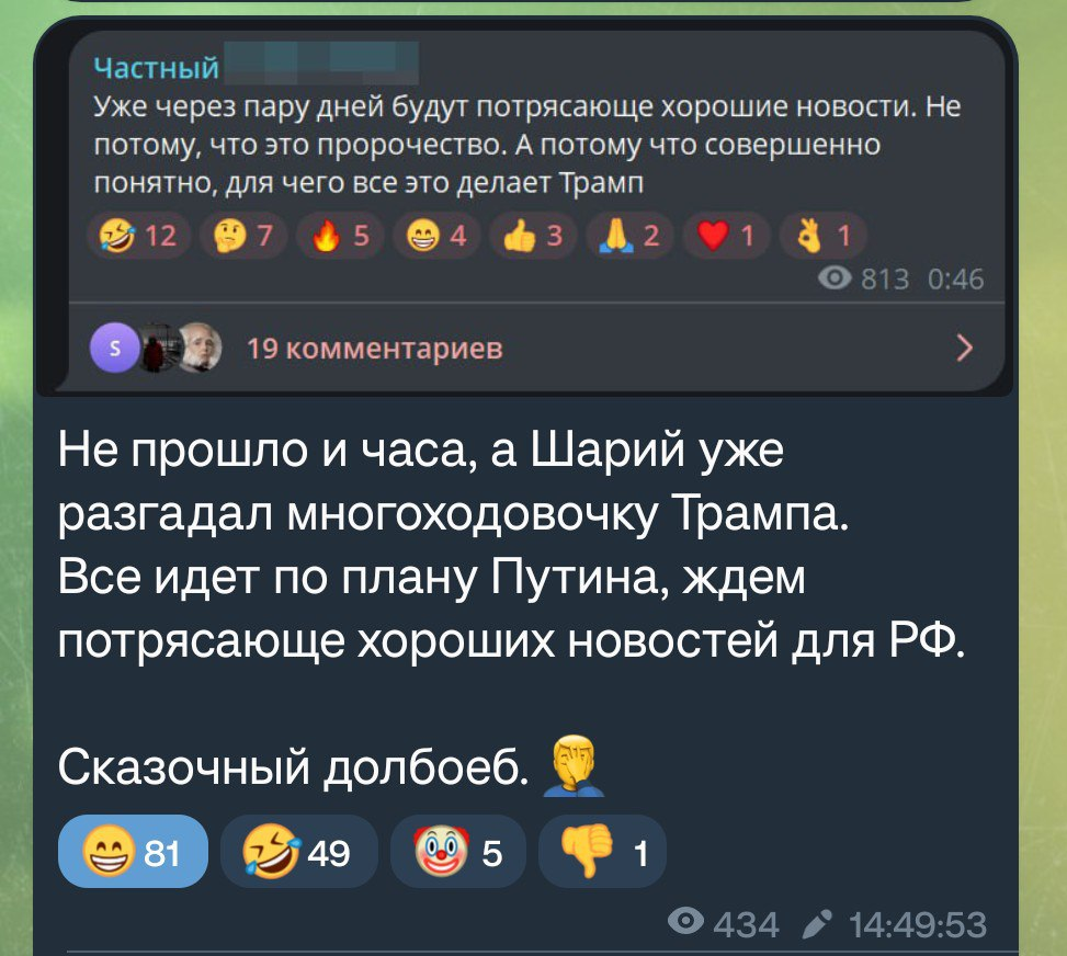 Я регулярно захожу на каналы z-военкоров в телеграмме, и каждый раз спрашиваю, есть ли хохлы в Курской области? Каждый раз мне отвечают, нет, идёт выдавливание. Я спрашивал уже раз 150 и 150 раз мне ответили "давим". Смысл в том, что отвечают мне одной и той же методичкой, отвечают с неизменным лицемерием. А я каждый раз с неизменной интонацией спрашиваю: - Хохлы есть? - Хохлов нет.