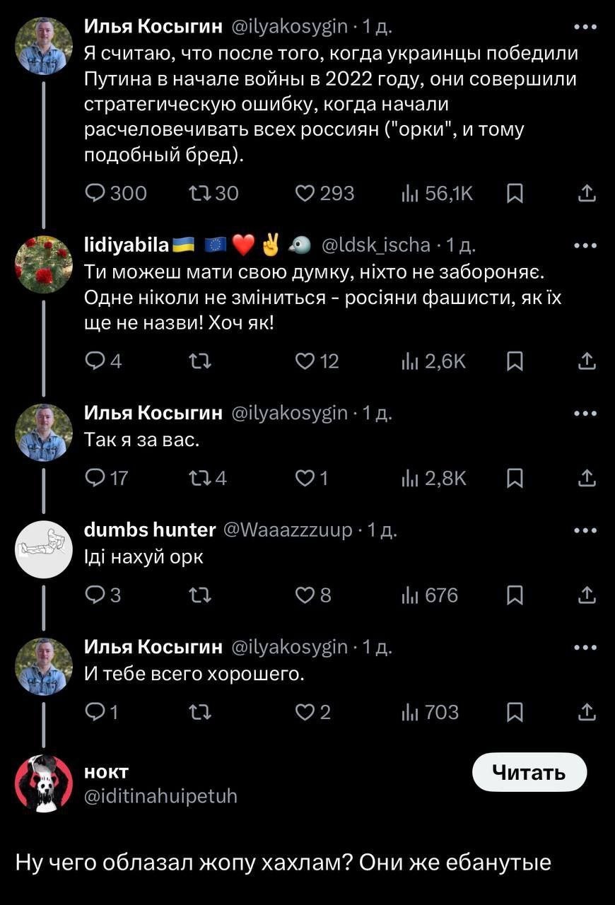 >>1156107 Горжусь я много чем. Просто я не вижу смысла, как вы, оскорблять Россию и Президента. Понимаешь, находясь на таком низком и уязвимом положении, оскорблять человека, который несоизмеримо находится выше тебя во властном отношении, - это просто расписаться в собственной беспомощности. Оскорблять человека, который может тебя раздавить как насекомое - это жалкое стремление возвыситься над собственным презренным статусом. Мы с Зедапом недавно это обсуждали на стриме. Типа, он и я не голосовали за Путина, мы за Даванкова топили, но народ выбрал Путина, при том подавляющее большинство россиян за него кинуло голоса. Мы должны уважать этот выбор. Поэтому это даже как-то не правильно с т.з. гражданской этики оскорблять его. Тем более сейчас идёт война, нахуя внутри страну качать лодку? Чтобы что? Если мы проиграем, думаешь, лучше жить начнем? Да нихуя.