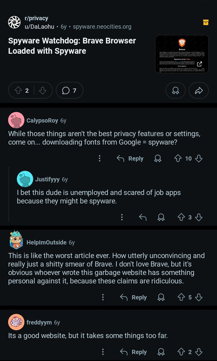 > Н-но я прочитал на сайте spyware watchdog, что брейв имеет высокий уровень телеметрии. Автор этих статей является труном, у которого уже не один год подгорает из-за Брендана Эйха, основателя Брейв. Подгорает по причине того, что Брендан является сторонником традиционных ценностей и не терпим к ЛГБТ. По этой причине, кстати, он и ушел с поста руководителя компании мазила, а позже основал Брейв. > Где пруфы того, что автор действительно трун и просто является слишком предвзятым? https://rentry.co/brave-trash А конкретно: It's no secret that Mozilla is a progressive company (a good thing), and as a result, half of Mozilla's board stepped down