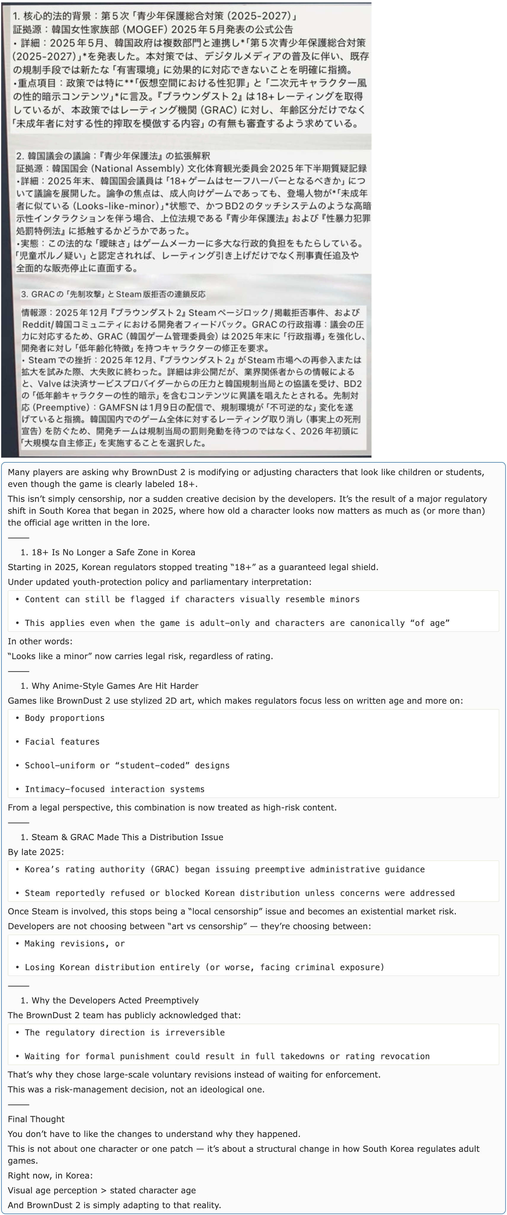 18+ больше не является безопасной зоной в Корее Начиная с 2025 года, корейские регуляторы перестали рассматривать "18+" как гарантированный юридический щит. В соответствии с обновленной политикой защиты молодежи и парламентской интерпретацией: Контент по-прежнему может быть помечен как недопустимый, если персонажи визуально напоминают несовершеннолетних. Это применимо, даже когда игра предназначена только для взрослых и персонажи канонически "в возрасте". Другими словами: "Похож на несовершеннолетнего" теперь несет юридический риск, независимо от рейтинга. Почему игры в аниме-стиле страдают сильнее Игры, подобные BrownDust 2, используют стилизованную 2D-графику, что заставляет регуляторов меньше фокусироваться на написанном возрасте и больше на: Пропорциях тела Чертах лица Дизайне школьной формы или "студенческом коде" Системах взаимодействия, ориентированных на интимность С юридической точки зрения, эта комбинация теперь рассматривается как контент с высоким риском. Steam и GRAC сделали это проблемой дистрибуции К концу 2025 года: Корейский рейтинговый орган (GRAC) начал выпускать превентивные административные указания Steam, как сообщается, отказал или заблокировал корейскую дистрибуцию, если проблемы не были решены Как только Steam оказывается вовлечен, это перестает быть проблемой "местной цензуры" и становится экзистенциальным рыночным риском. Разработчики выбирают не между "искусством и цензурой", они выбирают между: Полной потерей корейской дистрибуции (или того хуже, уголовным преследованием) Внесением изменений, или Почему разработчики действовали превентивно Команда BrownDust 2 признала, что: Регуляторная среда "необратима" Ожидание формального наказания может привести к полному отзыву рейтинга в 2026 году Это было решение руководства, а не внезапное идеологическое изменение. В конечном счете: Разработчики не должны были выбирать, что им нравится или не нравится менять. Речь идет не об одном персонаже или одной части - речь идет о структурных изменениях в том, как Южная Корея регулирует контент. Прямо сейчас, в Корее: Визуальный возраст персонажа важнее указанного возраста И BrownDust 2 просто адаптируется к этой реальности.